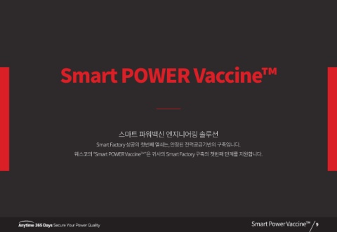 Smart POWER Vaccine™ 스마트 파워백신 엔지니어링 솔루션 Smart Factory 성공의 첫번째 열쇠는, 안정된 전력공급기반의 구축입니다. TM 웨스코의 “Smart POWER Vaccine ”은 귀사의 Smart Factory 구축의 첫번째 단계를 지원합니다. Smart Power Vaccine™ 9