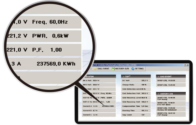 - Real-time input voltage, output voltage for each phase (R, S, T), Current, power(kw), power consumption(kWh), power factor display